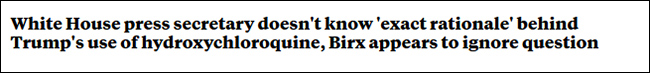 儘管特朗普的支持者福克斯新聞和老對手佩洛西都對服用羥氯喹表示異議,甚至提出了警告,但特朗普本人顯得信心十足,還反過來怒斥福克斯、回擊佩洛西。他甚至向記者表示,“這種藥名聲不好只是因為我在宣傳,顯然我是個糟糕的推廣者。但如果換個人推廣它,人們會説這是有史以來最偉大的事。”