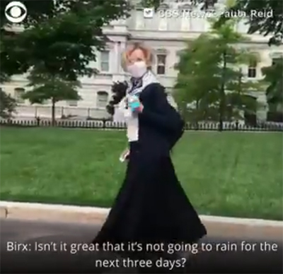 哥倫比亞廣播公司(CBS)的記者試圖採訪白宮新冠病毒應對工作組協調員黛博拉·伯克斯,詢問她關於羥氯喹的看法,但伯克斯卻顧左右而言他,説道:“接下來三天不會下雨,這很棒,不是嗎?”