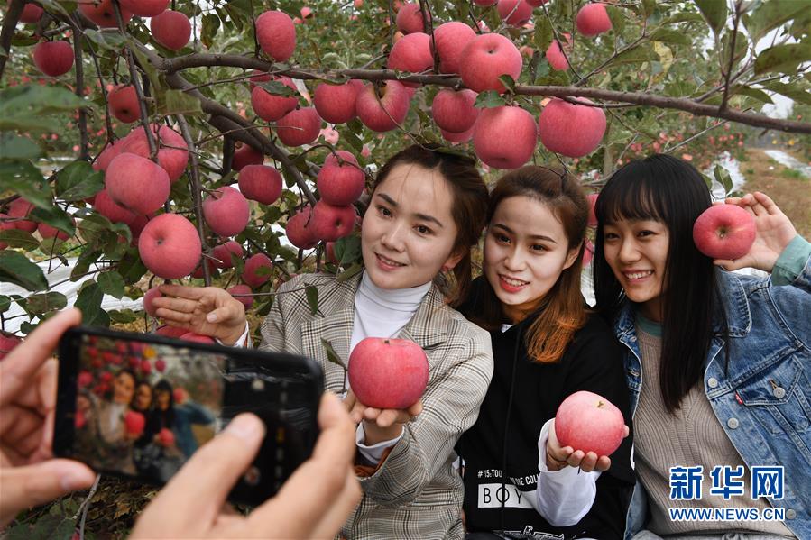 遊客在陝西省延安市志丹縣雙河鎮李家灣村果園拍照留影(2019年10月22日攝)。 新華社記者 陶明 攝