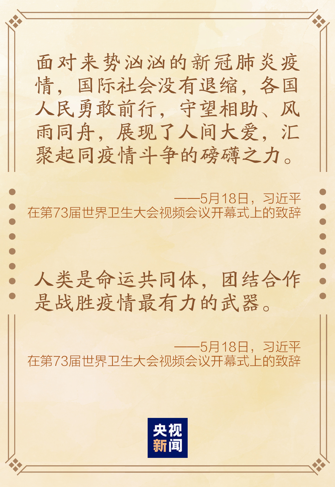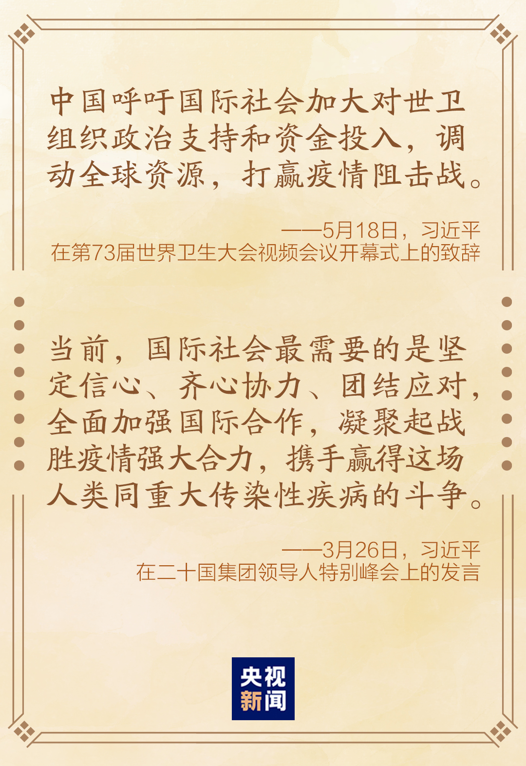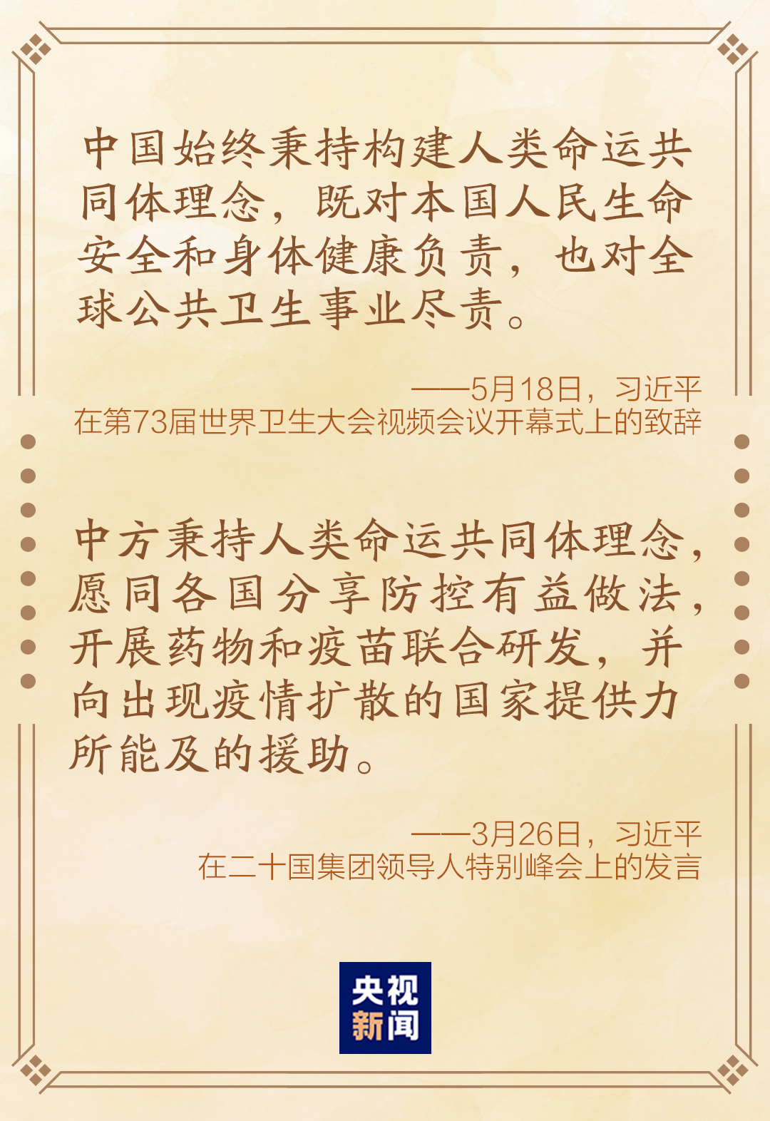 5月18日晚,國家主席習近平在第73屆世界衞生大會視頻會議開幕式上發表題為《團結合作戰勝疫情 共同構建人類衞生健康共同體》的致辭。這是繼3月26日晚,在二十國集團領導人應對新冠肺炎特別峯會發表重要講話之後,習近平主席再次以視頻方式參加國際會議。