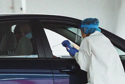 5月14日,在美國首都華盛頓一處“免下車”新冠病毒檢測站,工作人員採集樣本