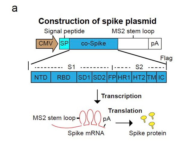 為了將全長刺突mRNA包裝到病毒模擬顆粒中,研究者還設計了一個刺突構建體,該刺突構建體在其轉錄物上表達帶有6X MS2 stem loop的刺突蛋白,這使得刺突mRNA通過與MS2外套融合的GagPol相互作用而被包裝到病毒模擬顆粒中。