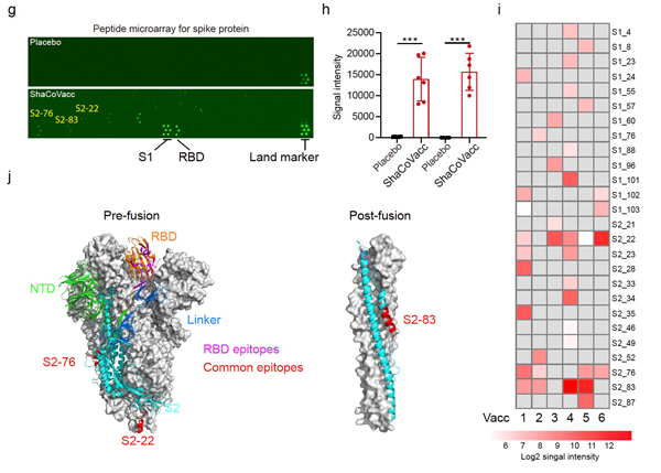 通過解剖接種疫苗的小鼠,可進一步瞭解刺突特異性抗體的線性表位特徵,研究者使用了一種新開發的肽微陣列,其中包含覆蓋刺突整個長度的短肽。研究者發現,與疫苗接種組的某些刺突肽相對應的信號強度各不相同,安慰劑治療的小鼠則未觀察到信號。