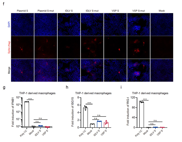 此外,研究者使用共聚焦分析法對轉染或轉導的293T細胞進行了確認,其表達了刺突。為了檢查病毒模擬顆粒的先天免疫特性,使用THP-1衍生的巨噬細胞作為核酸傳感模型,發現I型干擾素(IFN)和IFN刺激的基因ISG-15和視黃酸誘導的基因沒有明顯增加I(RIG-I)。由於帶刺突的病毒模擬顆粒比野生型對應物更有效地摻入了刺突的mRNA和蛋白,因此研究者選擇它作為體內評估的候選疫苗(指定為ShaCoVacc)。