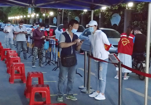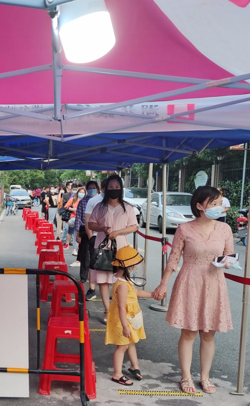 19日晚7點至9點,馬場社區在社區門前開闢了核酸檢測綠色通道,特設了為復工復產復學專場,為近300名上班族的居民羣眾和青年學生進行了核酸檢測,解除了他們持久戰疫防疫的後顧之憂。下圖為社區網格員為轄區的上班族居民羣眾等服務,教他們掃碼後,保持距離有序排隊,等待核酸檢測。