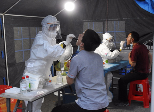 下圖為專職保健醫生冒着高温挑燈夜戰,為居民進行核酸檢測。