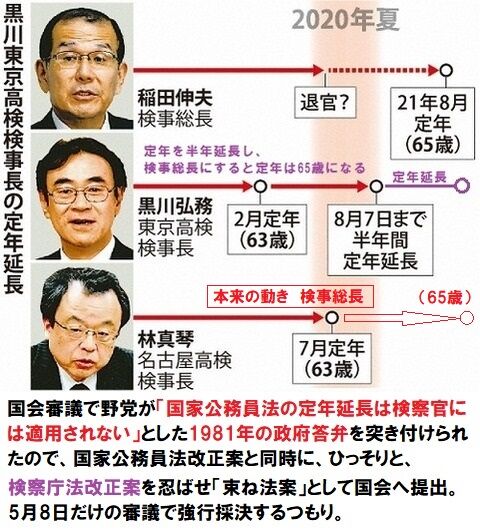 其實,現年63歲的黑川本應於今年2月退休(見上圖),是無法接任稻田的。但1月31日,安倍內閣會議上通過了黑川延長退休年齡半年的決定,讓他具有了接任檢察總長的可能。此次《檢察廳法》修正案若能通過,黑川最多可以再做5年。