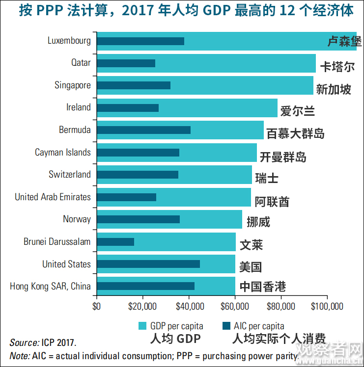而按PPP法計算,2017年人均GDP居前10位的經濟體分別為盧森堡、卡塔爾、新加坡、愛爾蘭、百慕大羣島、開曼羣島、瑞士、阿聯酋、挪威和文萊,入圍門檻為人均60282美元。