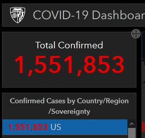 截至發稿,美國約翰斯·霍普金斯大學網站顯示,美國確證已超155萬(1551853例)。