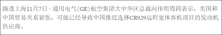 不過,路透社去年11月報道,通用電氣航空集團大中華區總裁向偉明表示,由於中美貿易關係緊張,中國可能已推遲選擇CR929遠程寬體客機項目的發動機供應商。