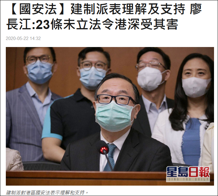 香港立法會建制派議員召集人廖長江指出,香港迴歸23年來仍未就《基本法》23條本地立法,令香港深受其害,亦危及14億中國人民福祉,在23條自行立法遙遙無期之下,有關草案有效維護國家安全、人民福祉,促進“一國兩制”行穩致遠。