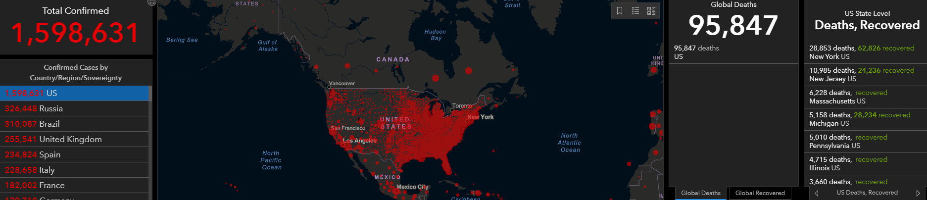 (觀察者網訊)據約翰斯·霍普金斯大學發佈的全球新冠肺炎數據,截至北京時間5月23日5時32分,美國新冠肺炎累計確診病例1598631例,24小時新增確診24889例;累計死亡病例95847例,24小時新增死亡1281例。