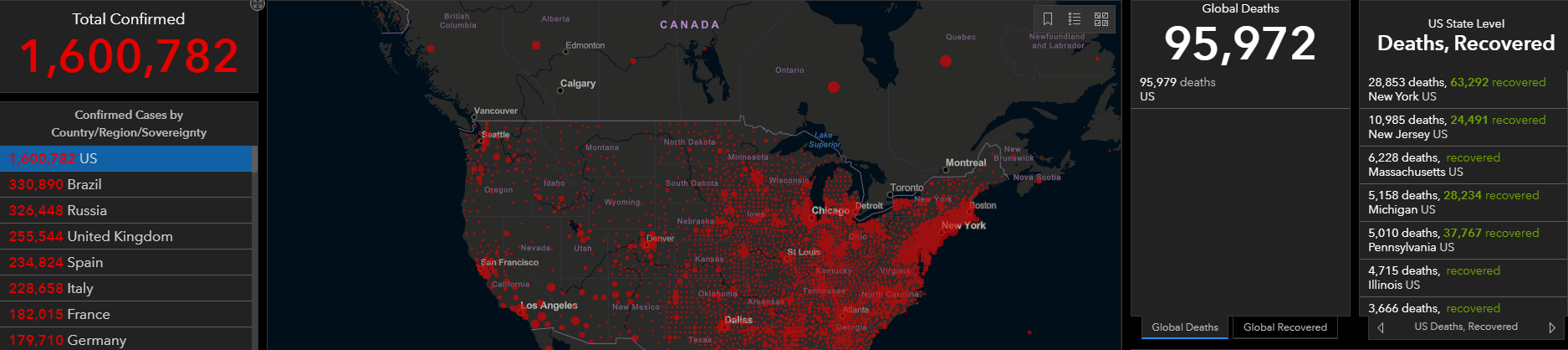 (觀察者網訊)據約翰斯·霍普金斯大學發佈的全球新冠肺炎數據,截至北京時間5月23日9時32分,美國新冠肺炎累計確診病例1600782例,累計死亡病例95972例。