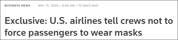 5月13日,路透社另一篇與美國航司有關的新聞顯示,美國三大航空公司當時要求空乘人員:不要強迫乘客遵守戴口罩的新政策,而是鼓勵他們這樣做。