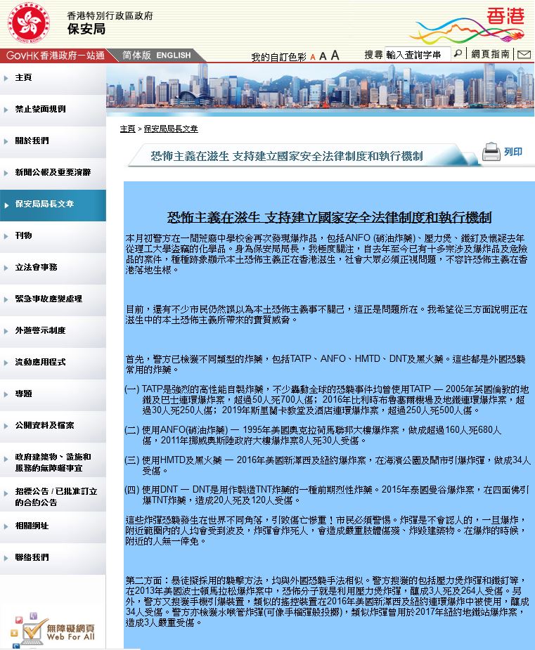 5月24日,香港特別行政區保安局局長髮表長文,指出恐怖主義正在滋生,支持建立國家安全法律制度和執行機制,全文如下: