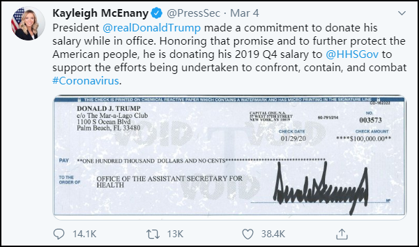 對於信息泄露一事,各大美媒尚未報道特朗普的回應,但是《赫芬頓郵報》報道特朗普上個季度——2019年第四季度——的薪水同樣捐獻給衞生與公眾服務部。今年3月,麥肯尼將上次捐款的支票曬在自己的推特上,所幸並未附上這次泄漏總統信息的文件。