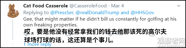 《赫芬頓郵報》稱,美國納税人時常因特朗普頻繁去他的私人高爾夫球場打球而感到愠怒。該報一項分析顯示,截至2月,特朗普的高爾夫之旅共花費1.338億美元,相當於他334年的工資。