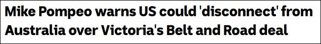 澳大利亞廣播公司5月24日報道,美國國務卿蓬佩奧在接受天空新聞採訪時表示,由於澳大利亞維多利亞州與中國簽署“一帶一路”協議,可能與澳大利亞“斷聯”。