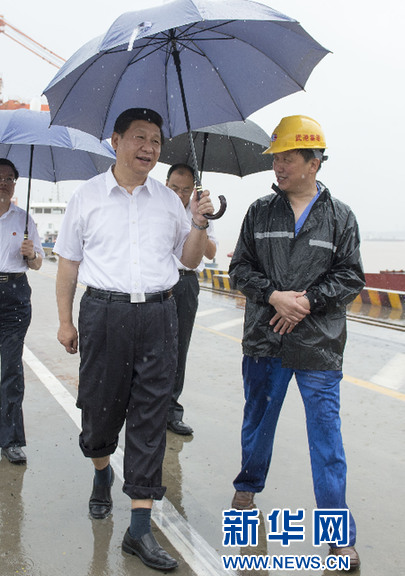 2013年7月21日至23日,中共中央總書記、國家主席、中央軍委主席習近平在湖北調研全面深化改革問題和當前經濟運行情況。 21日上午,習近平冒雨來到武漢新港陽邏集裝箱港區考察。 新華社記者 李學仁 攝