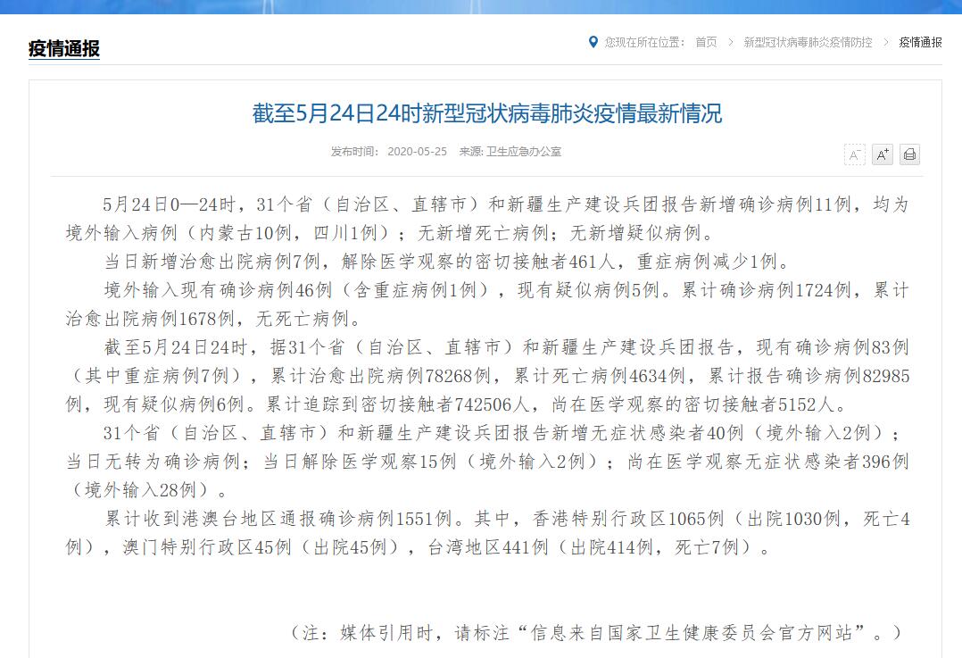 據國家衞生健康委5月25日通報,5月24日0—24時,31個省(自治區、直轄市)和新疆生產建設兵團報告新增確診病例11例,均為境外輸入病例(內蒙古10例,四川1例);無新增死亡病例;無新增疑似病例。