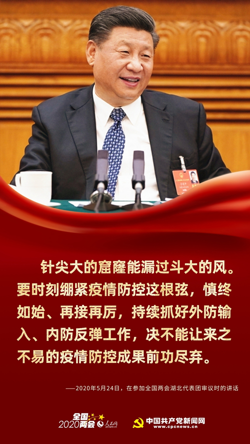 “針尖大的窟窿能漏過斗大的風。”在湖北代表團審議現場,習近平強調,要時刻繃緊疫情防控這根弦,慎終如始、再接再厲,持續抓好外防輸入、內防反彈工作,決不能讓來之不易的疫情防控成果前功盡棄。