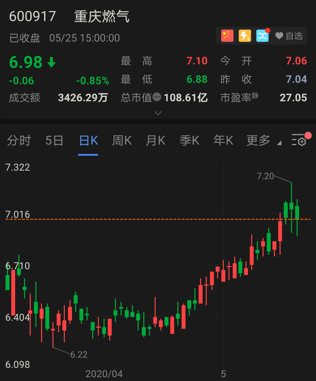 受此消息影響,5月22日,重慶燃氣開盤高開高走,盤中創下自1月23日以來新高。週一,該公司股價收跌近1%,市值仍高於108億元。