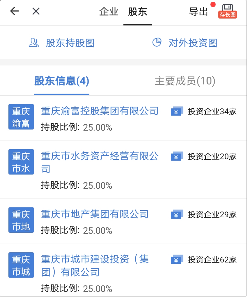 公告顯示,擬轉讓股權分別來自於重慶渝富資產經營管理集團有限公司、重慶市城市建設投資(集團)有限公司、重慶市地產集團有限公司、重慶市水務資產經營有限公司。觀察查詢啓信寶APP發現,上述四家股東持股比例均為25%。