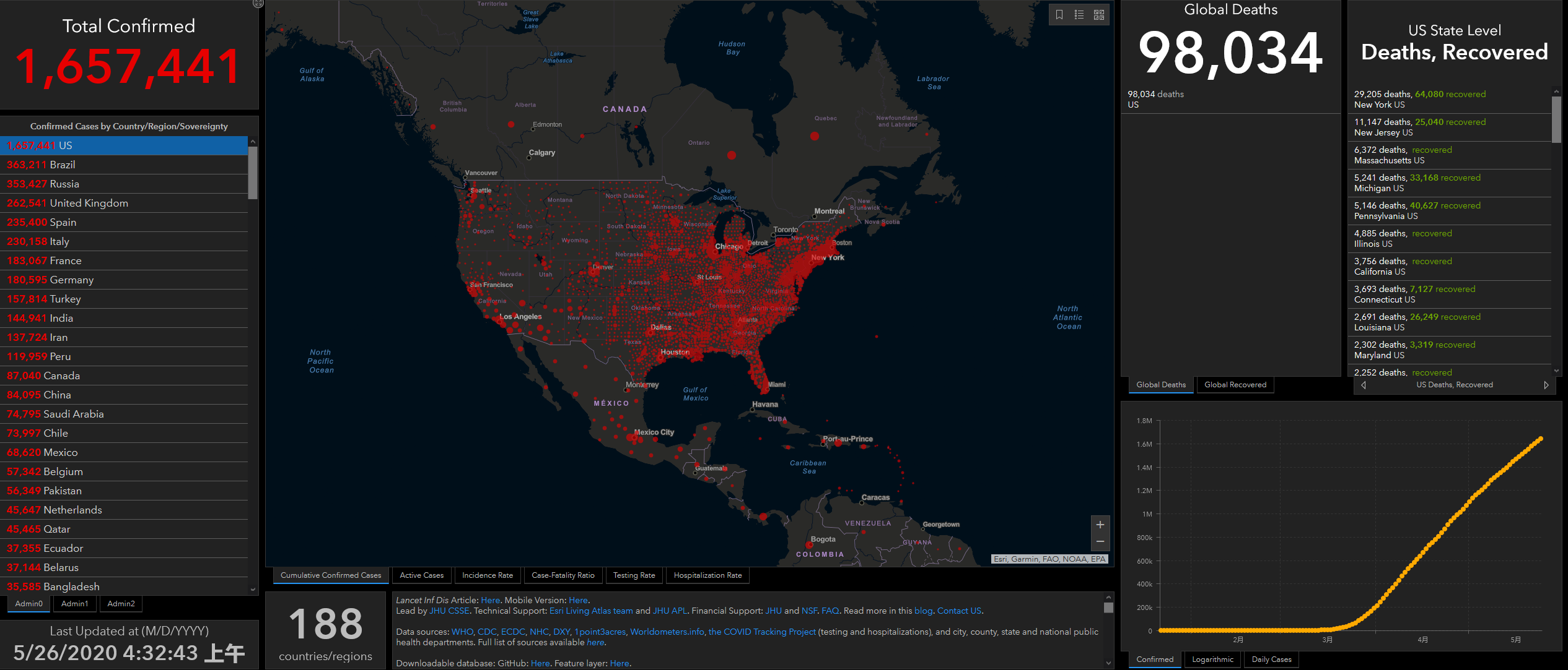 (觀察者網訊)據約翰斯·霍普金斯大學發佈的全球新冠肺炎數據,截至北京時間5月26日4時32分(美東時間5月25日16時32分),美國新冠肺炎累計確診病例達1657441例,死亡98034例。