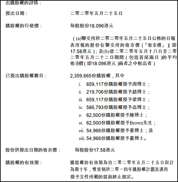 觀察者網注意到,該部分購股權的行權價為18.096港元/股,而股份授出日的收盤價為17.58港元/股。