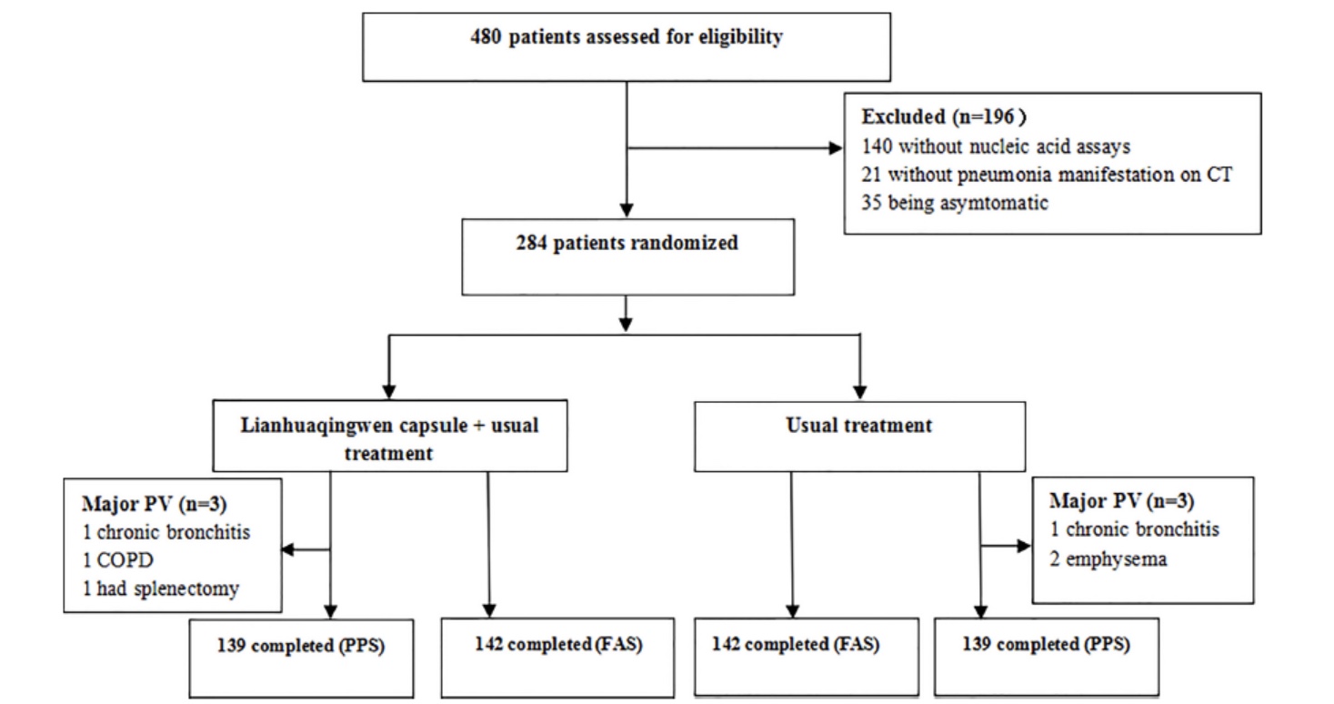 研究納入了284例患者,他們被隨機分配接受單獨的常規治療或常規治療與連花清瘟膠囊的組合(連花清瘟治療組和對照組各142例)。
