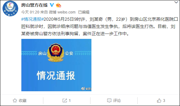 據北京市公安局房山分局官方微博(@房山警方在線 )5月27日消息,2020年5月25日9時許,劉某奇(男,22歲)到房山區北京燕化醫院口腔科就診時,因就診順序問題與當值醫生髮生爭執,後將該醫生打傷。目前,劉某奇被房山警方依法刑事拘留,案件正在進一步工作中。