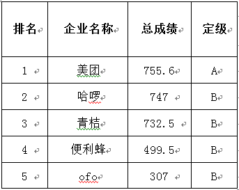 表1 北京市互聯網租賃自行車運營服務質量信用考核排名及成績明細