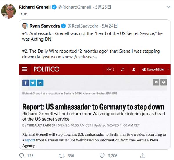 對於是否會回到柏林,格雷內爾回應稱大家很快就能知道。CNN援引接近格雷內爾的消息源稱,他可能會尋求一個更高的職位。本月21日,美國會參議院表決通過了特朗普對拉特克利夫出任國家情報總監的提名,拉特克利夫將接替格雷內爾,正式出任該職。格雷內爾將返回華盛頓並出席拉特克利夫的就職宣誓。