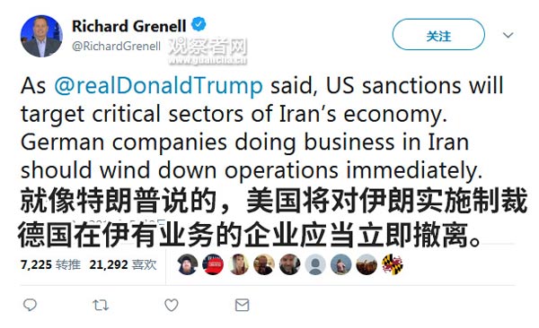 格雷內爾要求德方停止與伊業務 圖自社交媒體