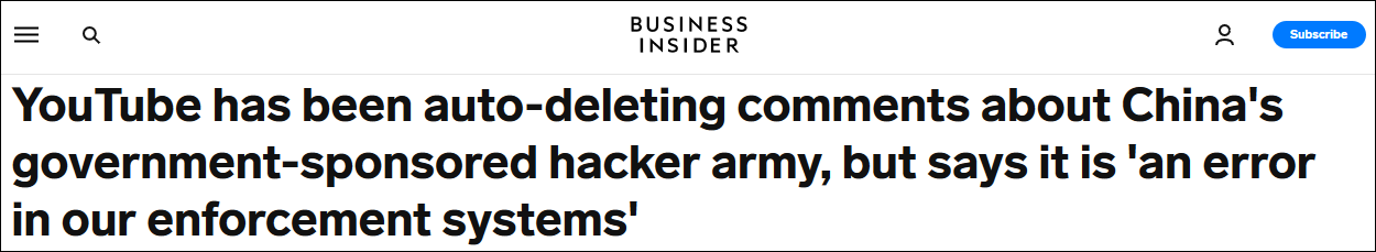 “刪評事件”引發輿論關注後,“YouTube”發言人艾薇·崔(Ivy Choi)26日在發給“商業內幕”的一份聲明中表示,用户所反映的評論留言被刪除一事屬實,竟稱這是一個“錯誤”。