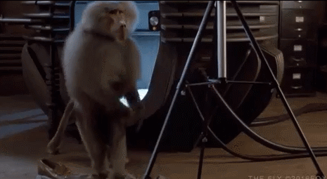 1986年美國20世紀福克斯出品的電影《變蠅人》,科學家男主角在拿狒狒做試驗