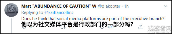 在白宮記者的推文下方,有評論稱“特朗普是否意識到推特不是行政機關”——
