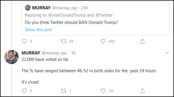 有趣的是,評論的下方,有網友發起了一個“推特是否應該把特朗普賬號給封了”的投票,有超過2萬名網友參與了投票,結果認為“是”與認為“不應該”的基本55開,各佔52%和48%,持肯定態度的稍多一些。