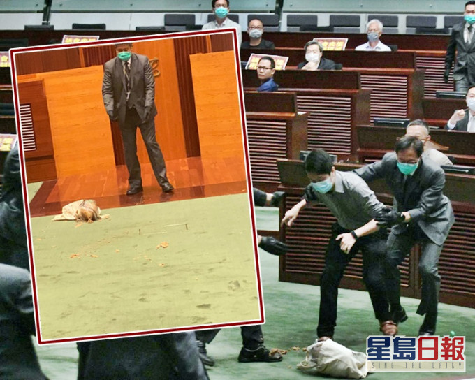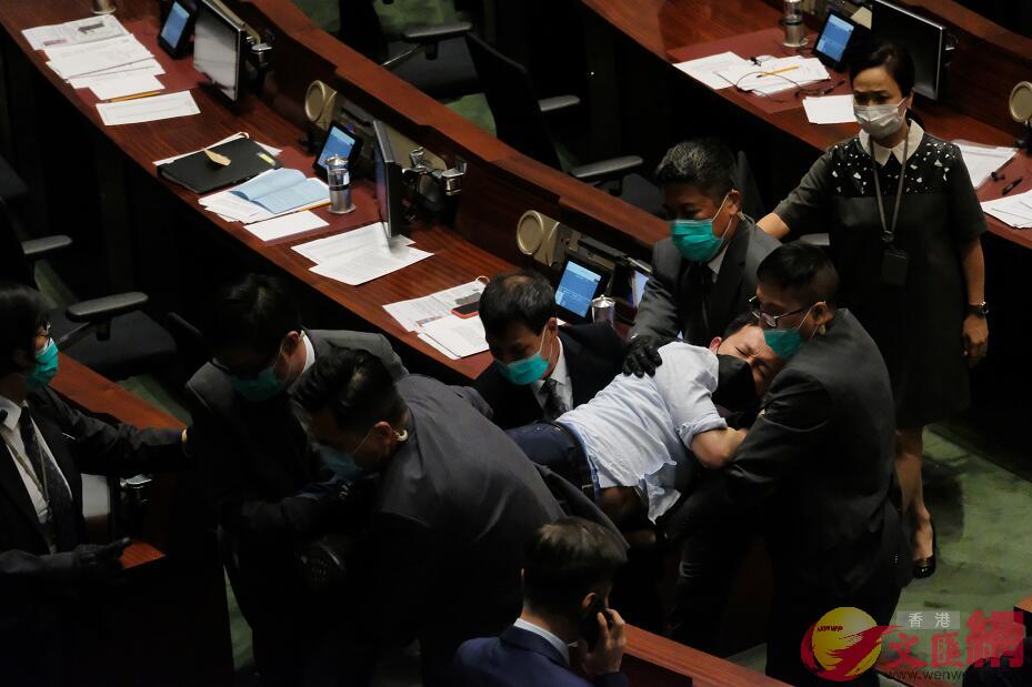 (觀察者網訊)經過前一日的攻防戰,香港立法會5月28日繼續二讀辯論《國歌條例草案》,反對派議員又一次搬出撒潑伎倆,大鬧會議廳,更有甚者向主席台丟擲“臭彈”,導致建制派議員陳凱欣不適送醫。會議開始約兩小時已3度暫停,3名反對派議員被驅逐。