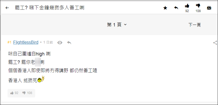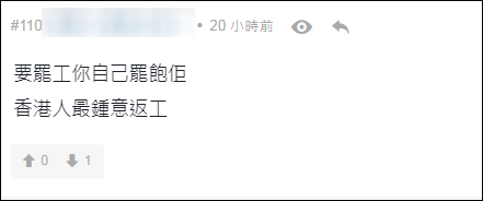 面對指責,沒有參與罷工的“手足”態度大變,直接反嗆説“要罷工你自己罷,香港人最喜歡工作”、“怕只有你沒班上吧”……