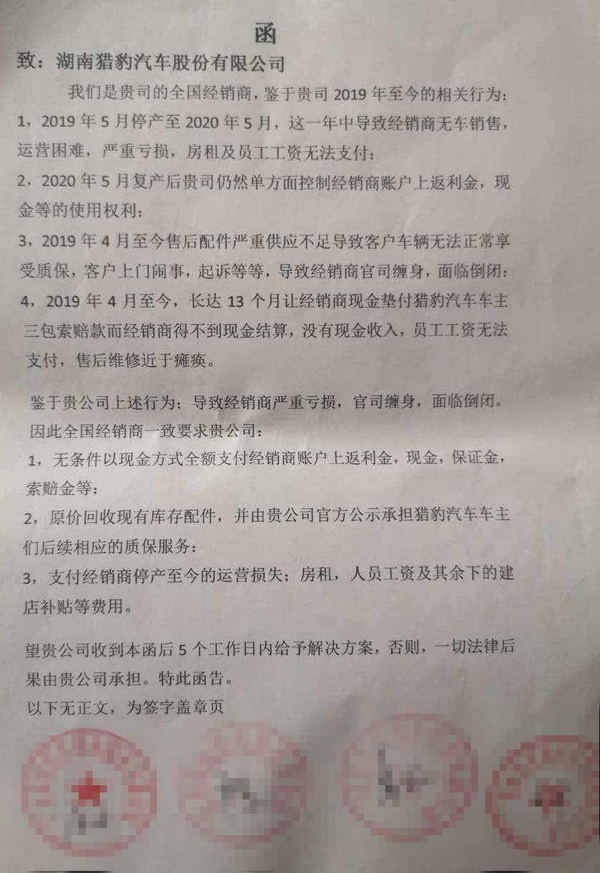 從一份經銷商致獵豹汽車的函中顯示,獵豹汽車自2019年4月便不再生產汽車,導致經銷商無車可售、運營困難、虧損嚴重,無法支付房租和員工工資。即便如此,獵豹汽車仍單方面控制經銷商返利金、現金等使用權利。
