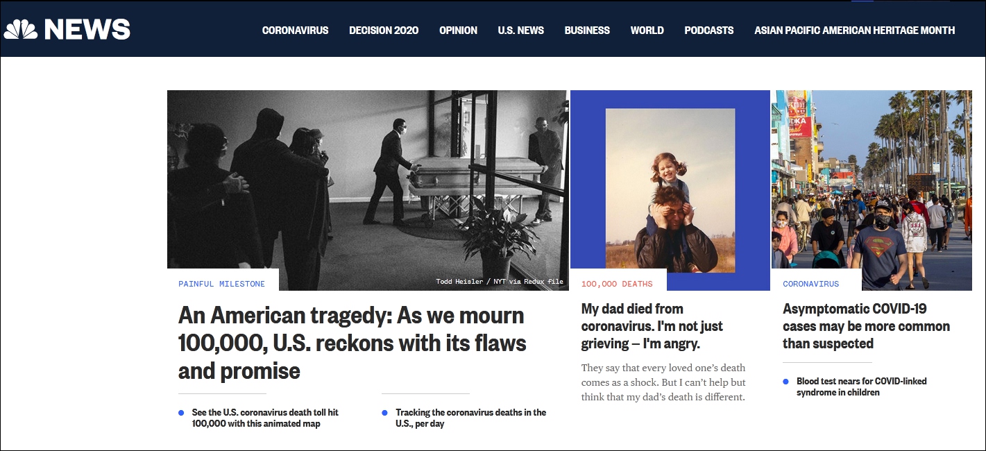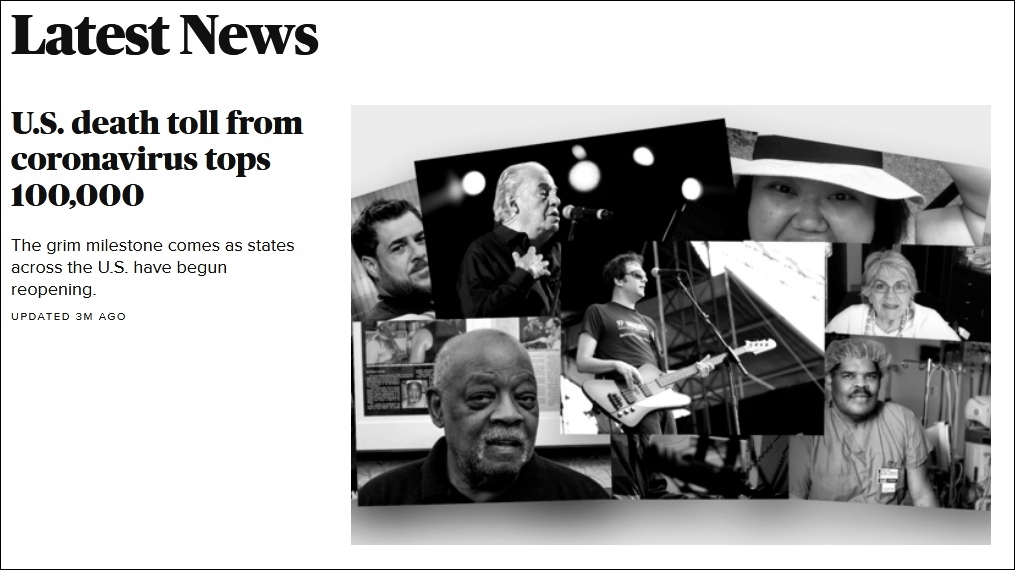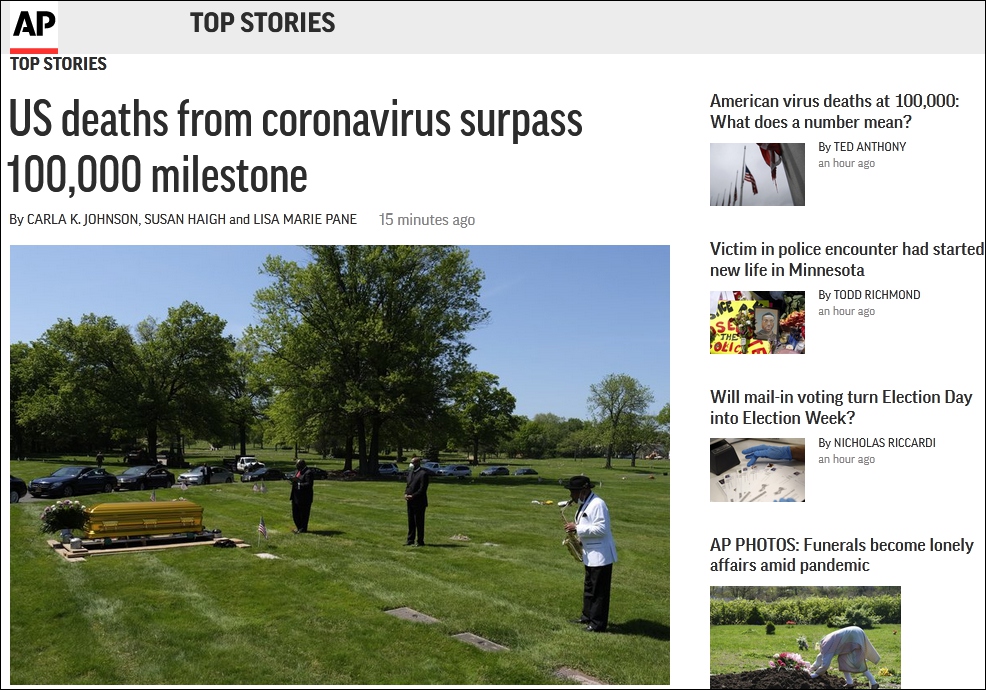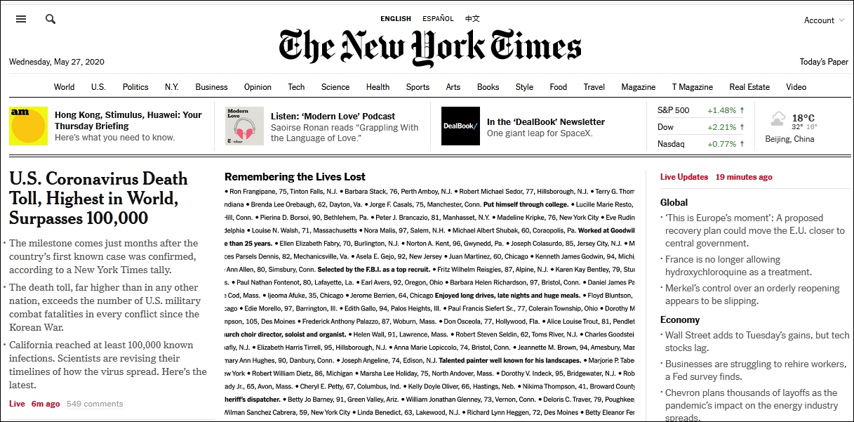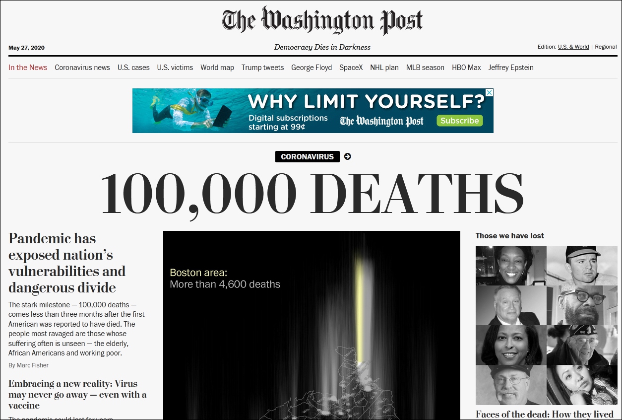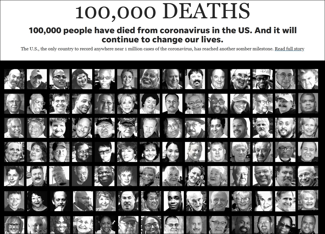 《華盛頓郵報》評論稱,死亡人數破十萬的這一天,就像是普通一天一樣流逝了,地球又轉了一圈,一堆令人麻木的壞消息裏又多出來一個頭條。