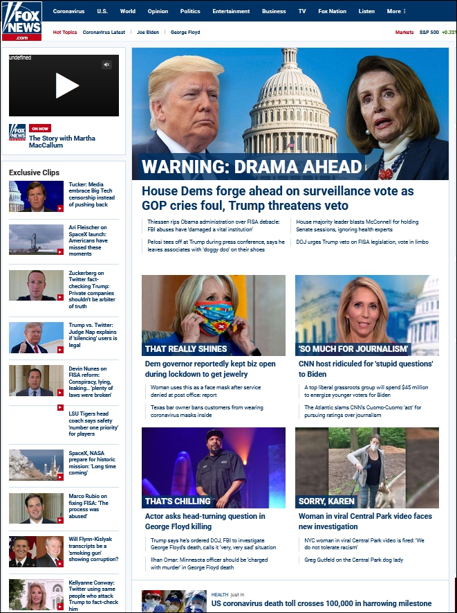 福克斯新聞網站截圖,死亡人數破十萬的消息被放在了很下邊的位置