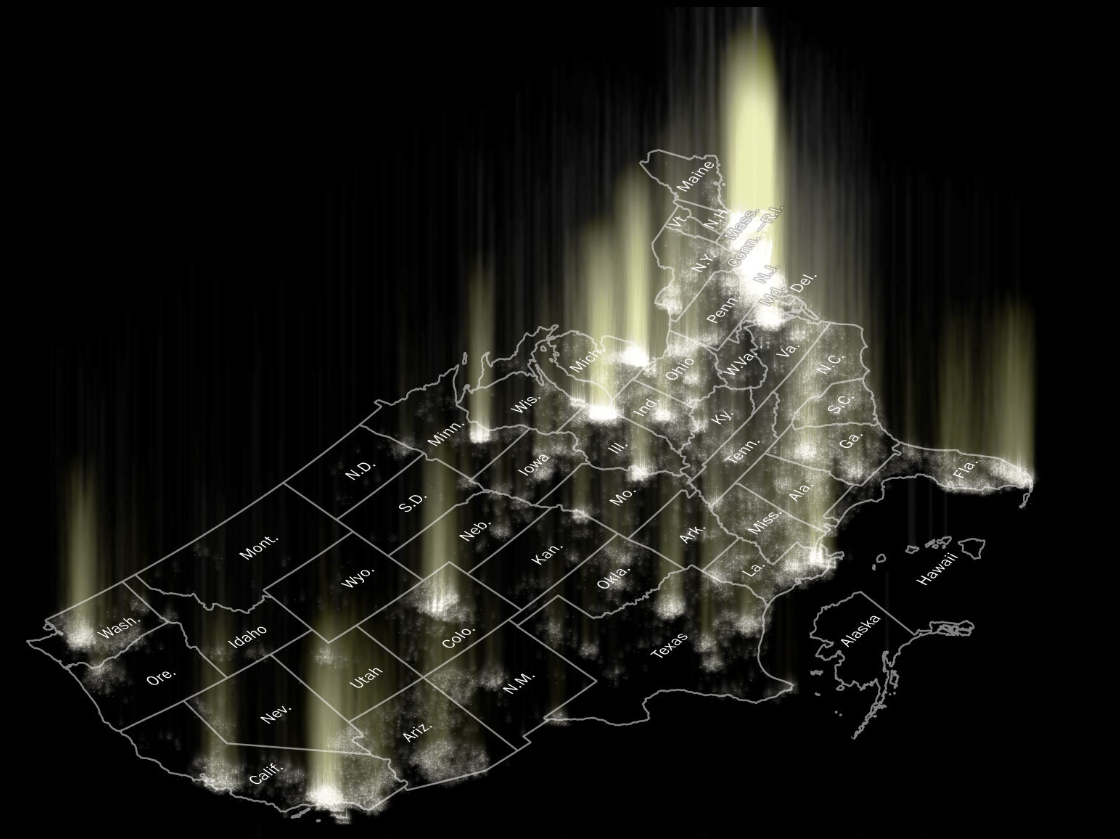 《華盛頓郵報》製作的美國各州死亡人數(光柱高度)統計圖