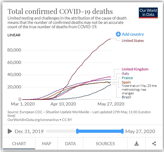 美國的死亡人數遠超世界各國 圖表來源:牛津大學用數據看世界網站