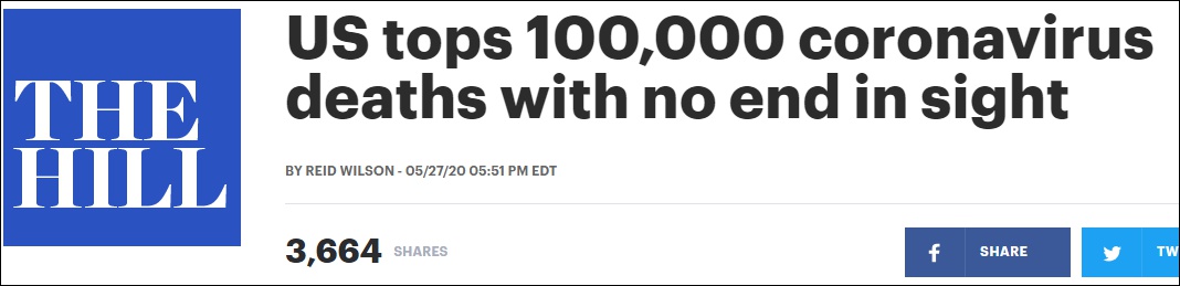 《國會山報》也無奈地表示,美國已經因新冠肺炎死了十萬人,可這場危機目前還看不到頭。