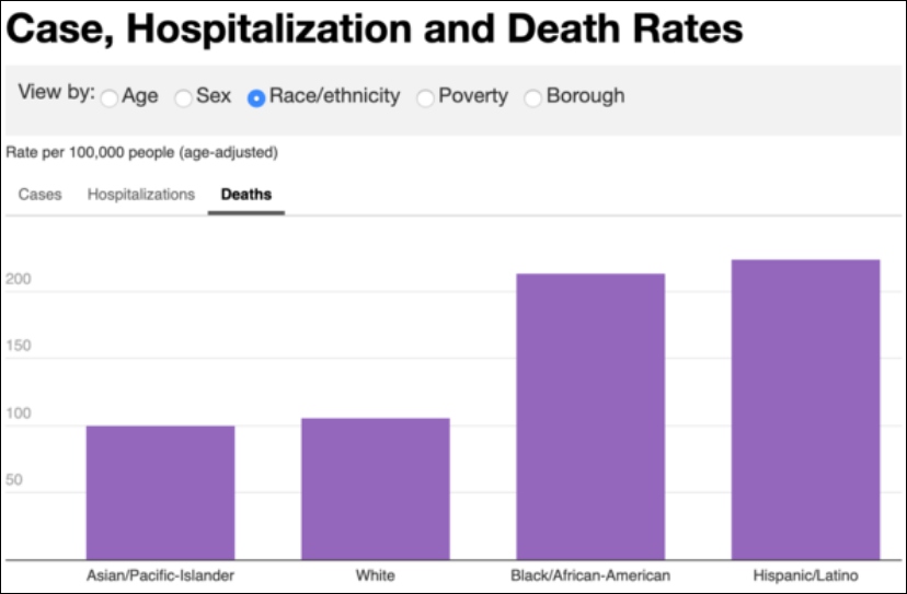 貧富差距則更加可怕。《華盛頓郵報》以紐約市皇后區一條公交線路兩邊的兩個社區為例稱,這兩個社區間的死亡率相差800%。因為富人生活水平搞,負擔得起良好的醫保,而窮人生活水平低,而且害怕尋求醫療救助,一方面因為他們是非法移民,另一方面也可能是因為他們沒有醫療保險。