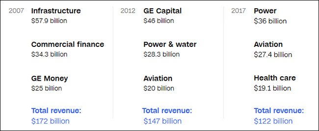 2007年到2017年通用電氣的主要業務和總收入都持續下降,CNN報道截圖