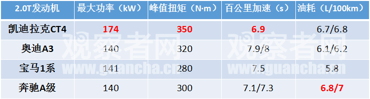 單看參數,CT4的2.0T發動機性能對比競品有着顯著優勢,油耗也要高於A3、1系,略低於A級