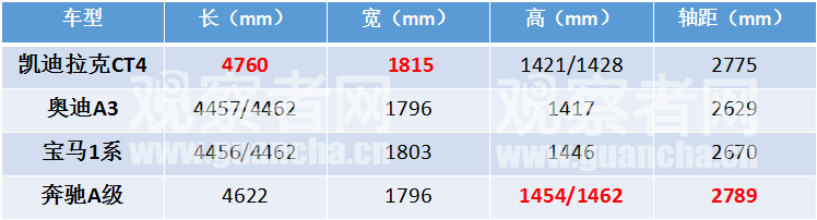 車身尺寸來看,凱迪拉克CT4的長寬均領先於同級對手,軸距則略短於加長後的奔馳A級,而為了更好地體現出轎跑的特性,整車高度低了許多,不及寶馬1系和奔馳A級。